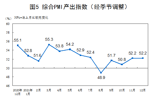 三、中国综合PMI产出指数运行情况 12月份,综合PMI产出指数为52.2%,与上月持平,表明我国企业生产经营活动总体稳定扩张。