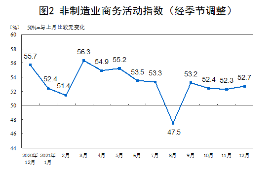 二、中国非制造业采购经理指数运行情况 12月份,非制造业商务活动指数为52.7%,比上月上升0.4个百分点,高于临界点,非制造业恢复步伐加快。
