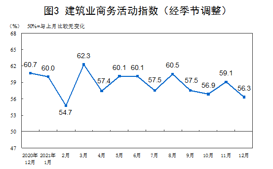 分行业看,建筑业商务活动指数为56.3%,比上月下降2.8个百分点。服务业商务活动指数为52.0%,比上月上升0.9个百分点。从行业情况看,航空运输、电信广播电视及卫星传输服务、货币金融服务、资本市场服务、其他金融等行业商务活动指数位于60.0%以上高位景气区间;零售、住宿、房地产、租赁及商务服务、居民服务等行业商务活动指数低于临界点。