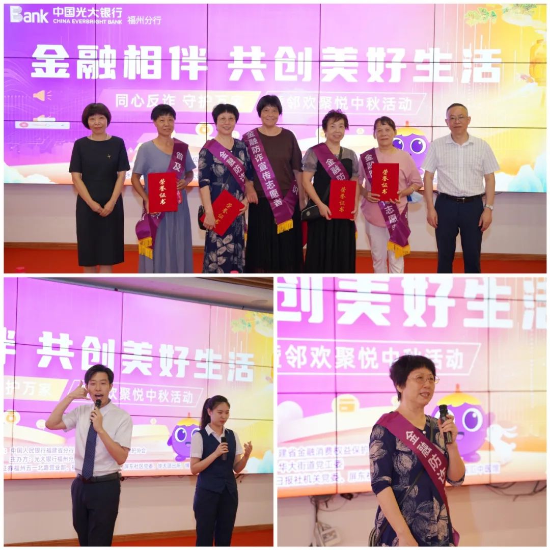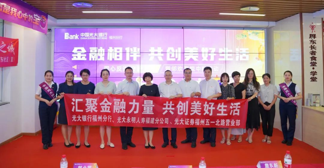 光大银行福州分行 联合光大集团驻闽单位 开展金融知识“进社区”活动 9月26日,在中国人民银行福建省分行、福建省金融消费权益保护协会指导下,中国光大银行福州分行携手光大集团在闽单位,联合华大街道党工委共同走进福州鼓楼屏东社区,开展了一场“同心反诈 守护万家”暨“邻欢聚悦”中秋活动。中国人民银行福建省分行金融消保处调研员、福建省金融消费权益保护协会副会长詹东新,中国光大银行福州分行党委委员、副行长刘辉,光大永明人寿福建分公司副总经理林小福,光大证券福州营业部总经理陈畅及相关主办单位负责人参加。