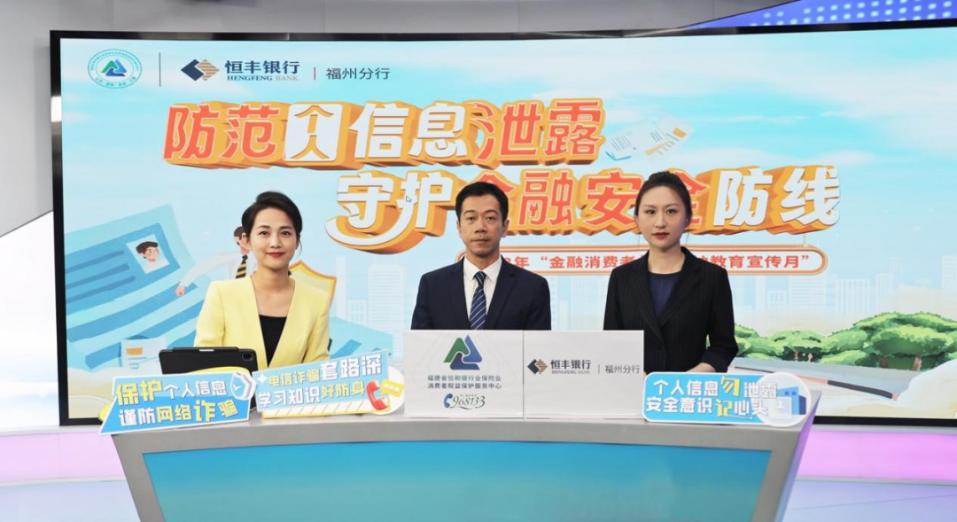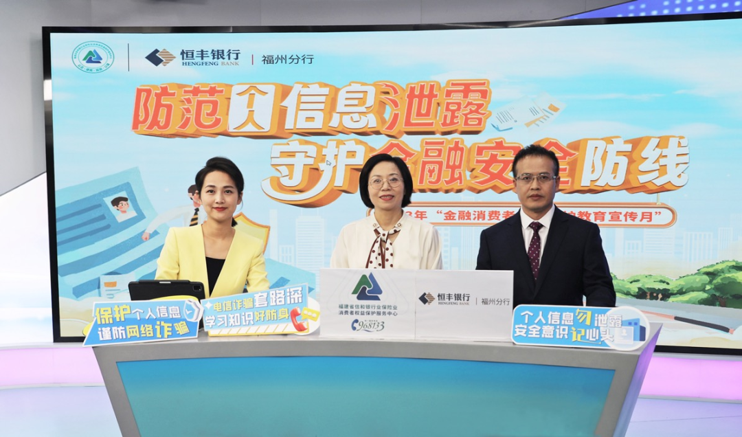 为进一步落实开展“金融消费者权益保护宣传月”活动,保护个人信息安全,防范网络诈骗。2023年10月9日,恒丰银行福州分行携手福建省信和银行业保险业消费者权益保护服务中心、福建通享律师事务所共同举办“防范个人信息泄露 守护金融安全防线”主题直播活动。活动邀请福建省信和银行业保险业消费者权益保护服务中心副主任姜萍,恒丰银行福州分行行长助理杨靖、法律合规部负责消费者权益保护工作人员,福建通享律师事务所律师林丰夏做客东南网直播间,围绕“个人金融信息”泄露风险、维权方式、保护举措等进行线上分享,为观众朋友们送上知识“盛宴”。直播通过东南网微赞、福建日报全媒体、视频号、百家号平台同步进行,各类平台累计约121.69万网友观看。