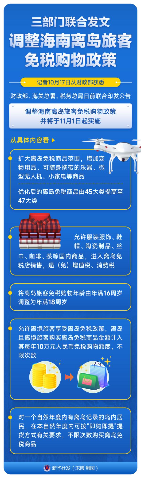 新华社北京10月17日电(记者刘开雄、申铖)记者17日从财政部获悉,财政部、海关总署、税务总局日前联合印发公告,为稳步推进海南自由贸易港建设,进一步满足消费者多元化购物需求,调整海南离岛旅客免税购物政策,并将于11月1日起实施。 从具体内容看,一是扩大离岛免税商品范围,增加宠物用品、可随身携带的乐器、微型无人机、小家电等商品。优化后的离岛免税商品由45大类提高至47大类。二是允许服装服饰、鞋帽、陶瓷制品、丝巾、咖啡、茶等国内商品,进入离岛免税店销售,退(免)增值税、消费税。三是将离岛旅客免税购物年龄由年满16周岁调整为年满18周岁。四是允许离境旅客享受离岛免税政策,离岛且离境旅客购买离岛免税商品金额计入其每年10万元人民币免税购物额度,不限次数。五是对一个自然年度内有离岛记录的岛内居民,在本自然年度内可按“即购即提”提货方式有关要求,不限次数购买离岛免税商品。 政策调整后将有利于扩大离岛免税政策享惠面,增加商品供给,改善消费者购物体验,提升岛内居民获得感,推动海南自由贸易港建设不断取得新成效。