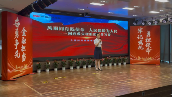 10月15日,福建省委金融办、人行福建省分行、福建金融监管局、福建证监局共同主办的全省金融系统学习宣传贯彻习近平同志在闽金融论述与实践宣讲活动在福州隆重举行。经层层选拔,包括人保财险在内的省内15家金融单位组成全省金融系统宣讲团,人保财险是福建保险行业的唯一入选代表,在活动现场集中开展宣讲。 活动中,人保财险龙岩市分公司理赔中心曾煜作为全省金融系统宣讲团成员,以“风雨同舟践使命,人民保险为人民——闽西救灾理赔的责任答卷”为主题作专题宣讲,生动讲述了龙岩市分公司在龙岩市委、市政府的坚强领导以及龙岩金融监管分局和上级公司党委的统筹部署下,在“6·16”龙岩特大暴雨灾害中,灾后理赔工作中的担当与为民情怀,充分展现了福建人保人牢记嘱托、挺膺担当,以实际行动诠释金融初心、以不懈奋斗践行时代使命的良好风貌。活动现场气氛热烈,掌声阵阵。 公司将持续深入学习宣传贯彻习近平同志在闽金融论述与实践,进一步完善宣讲体系,丰富宣传教育形式,积极培育和弘扬中国特色金融文化,走好中国特色金融发展之路,不断推动公司高质量发展,为金融强省建设贡献福建人保力量。 |