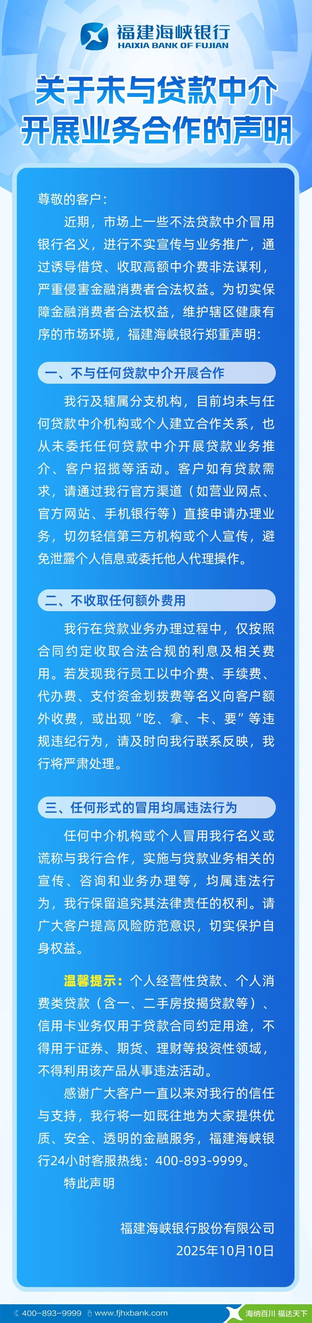 福建海峡银行关于未与贷款中介开展业务合作的声明