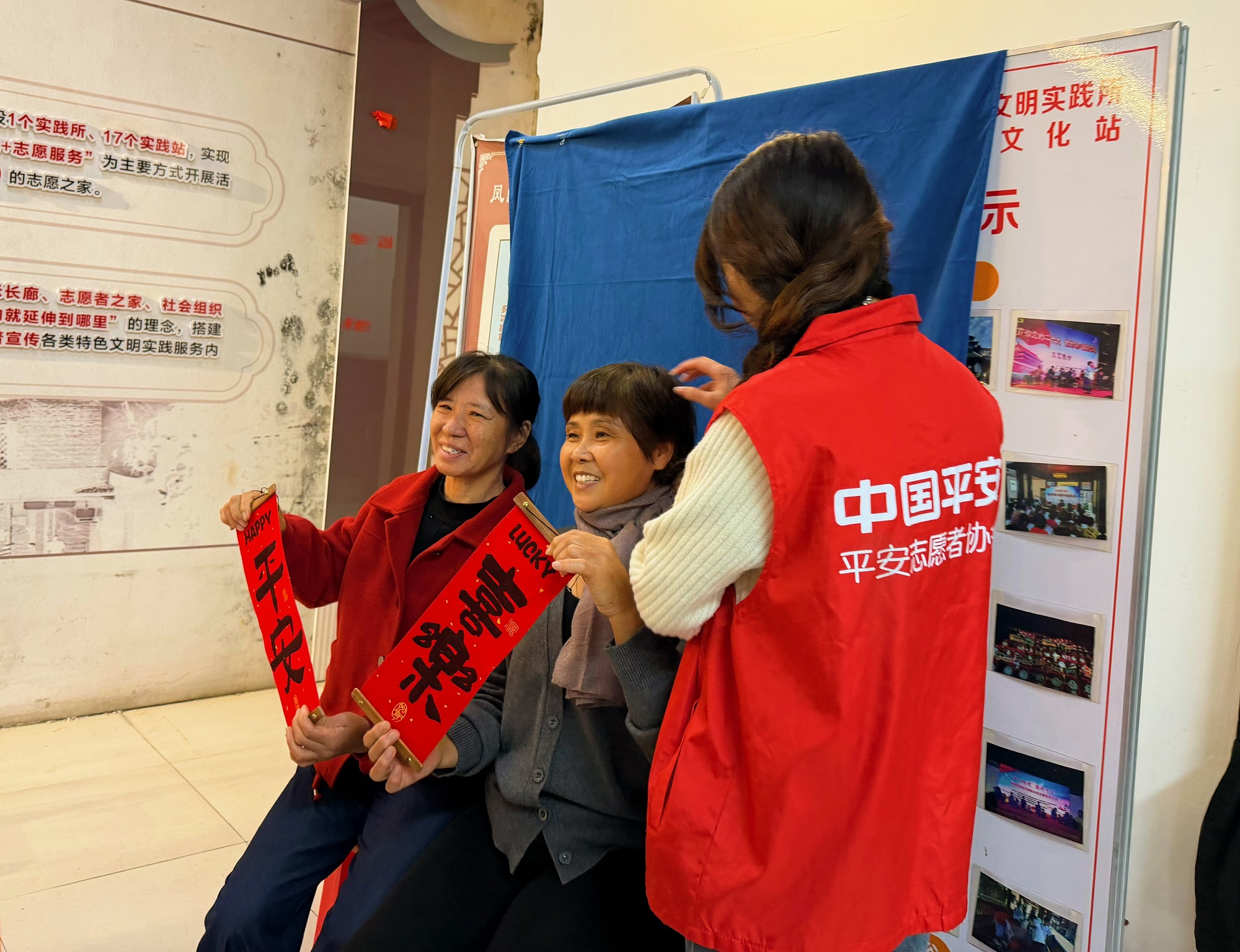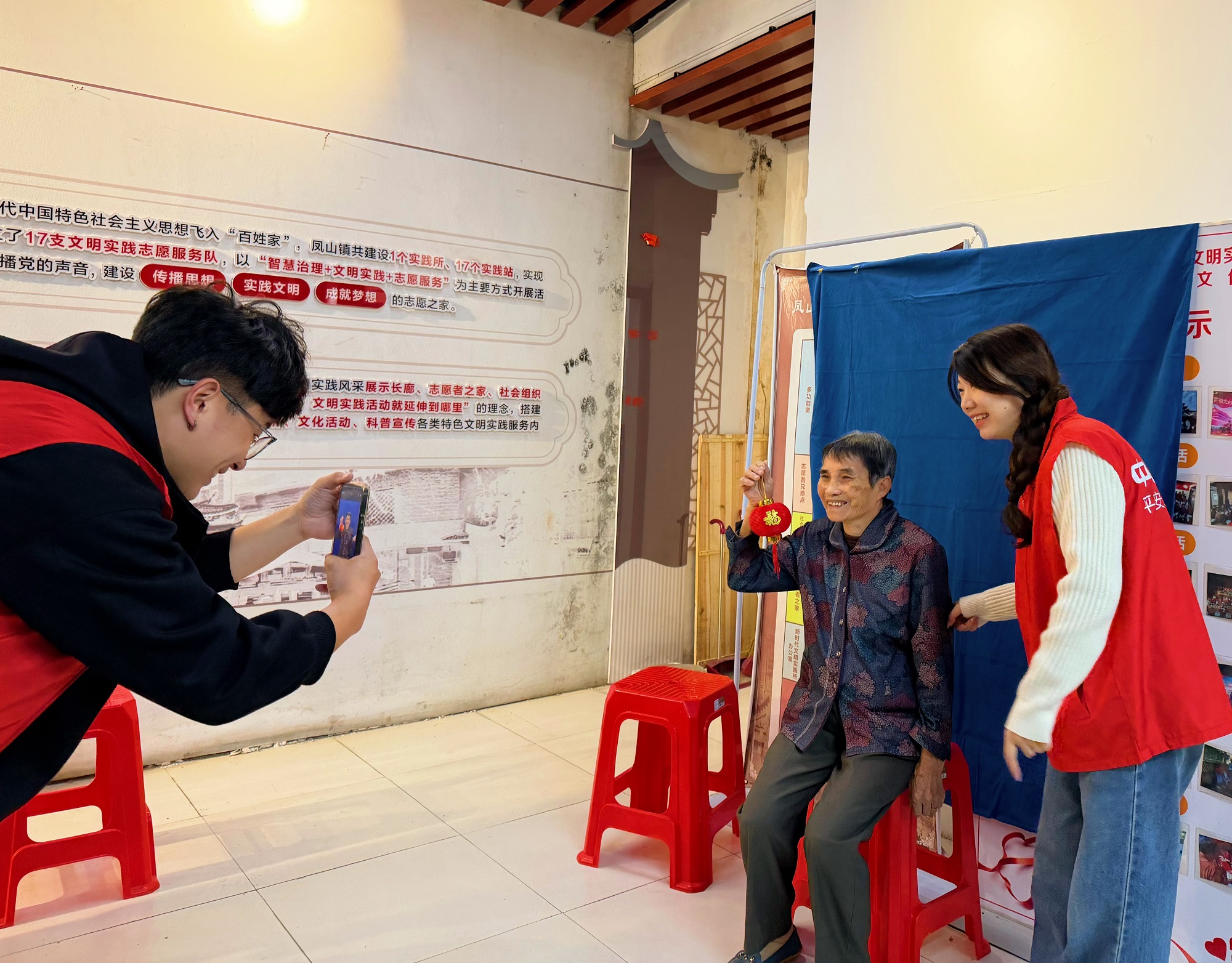 活动尚未开始,社区的院子里已坐满了闻讯赶来的银发长者。平安产险志愿者们迅速支起镜子、摆开工具,一个温馨的“移动理发店”便在冬日阳光下开张了。 “阿婆,想剪短些还是修修型?”志愿者小林弯下腰,在嗡嗡的推剪声中贴近一位奶奶耳边耐心询问。他的动作轻柔而熟练,一梳一剪间,不仅修整着发型,更梳理着岁月。 在这里,剪刀剪去的是时间的凌乱,梳子理顺的是晚年的从容。这间没有门面的“移动理发店”,送上的不仅是便利,更是一份被郑重对待的关怀。 一颦一笑:定格温暖时光,“移动照相馆”的镜头传情 理完发,精神焕发的长者们被引至另一片精心布置的天地。这是平安产险志愿者们此行的“惊喜”小行动——他们用鲜艳的背景布、喜庆的中国扇、写着“平安喜乐”的绒布横幅,以及各式各样的可爱道具,共同组成了这天最受欢迎的“暖冬移动照相馆”,在这个寒气渐渐的冬日里,为老人们留下最热情红火的岁月纪念照。