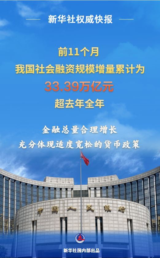 中国人民银行12月12日发布金融统计数据显示,前11个月,我国社会融资规模增量累计为33.39万亿元,超去年全年。11月末,广义货币(M2)余额336.99万亿元,同比增长8%;人民币贷款余额271万亿元,同比增长6.4%。金融总量合理增长,充分体现适度宽松的货币政策。