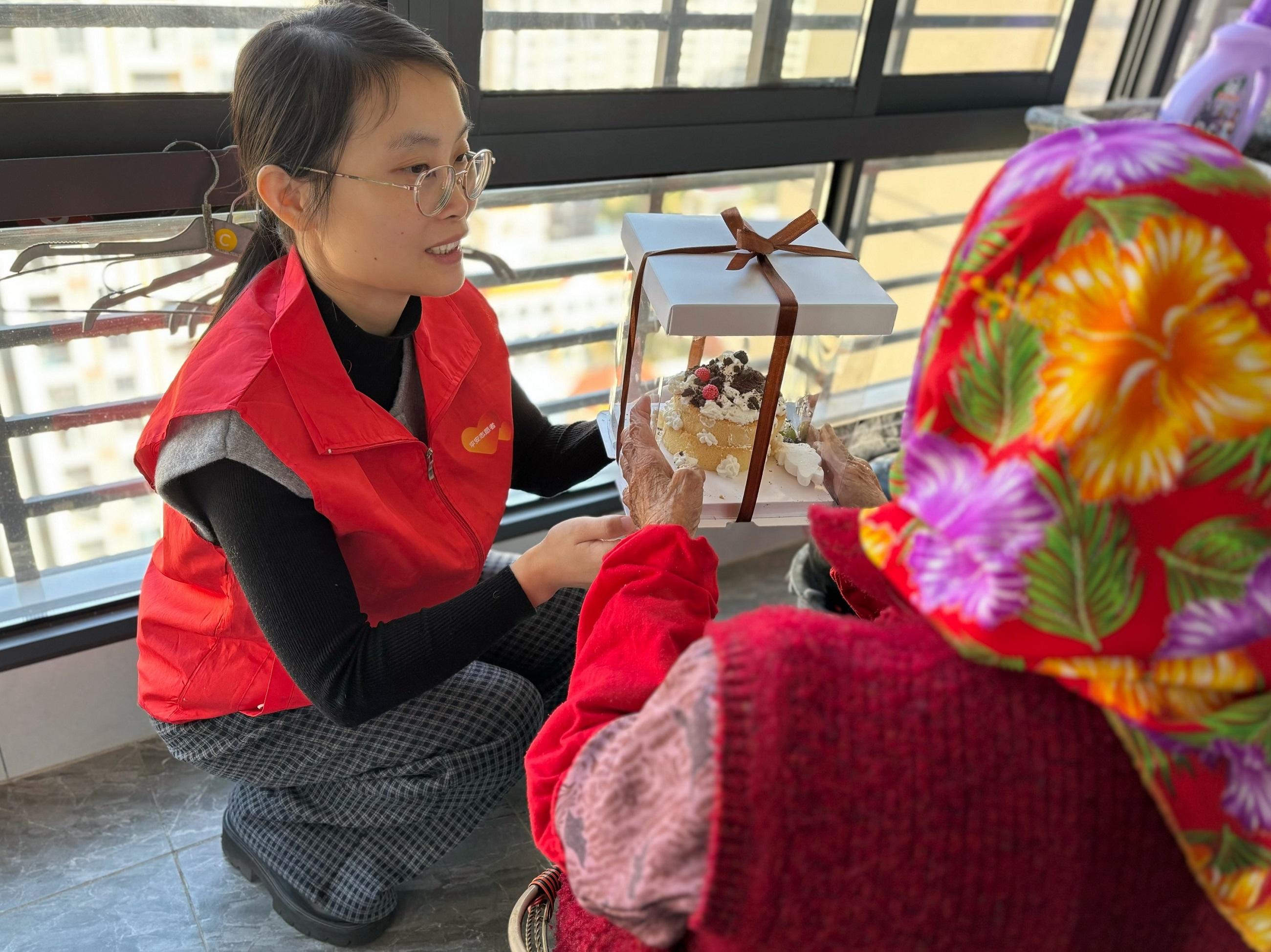 烘焙环节落幕,爱心之旅随即启程。志愿者们带领小朋友分组前往独居老人家中,孩子们捧着亲手制作的蛋糕,用清脆的童声向老人们送上问候与祝福。老人们接过蛋糕,皱纹里漾开欣慰的笑意,有的拉着孩子的手细细询问学习生活,有的翻出珍藏的糖果塞到孩子掌心。志愿者们则主动帮老人打扫房间、整理家务,陪老人话家常,还为老人讲解冬季居家安全知识,将“平安”的守护落到实处。小小的房间里,蛋糕的甜香与欢声笑语交织,温馨的氛围驱散了冬日的清冷。