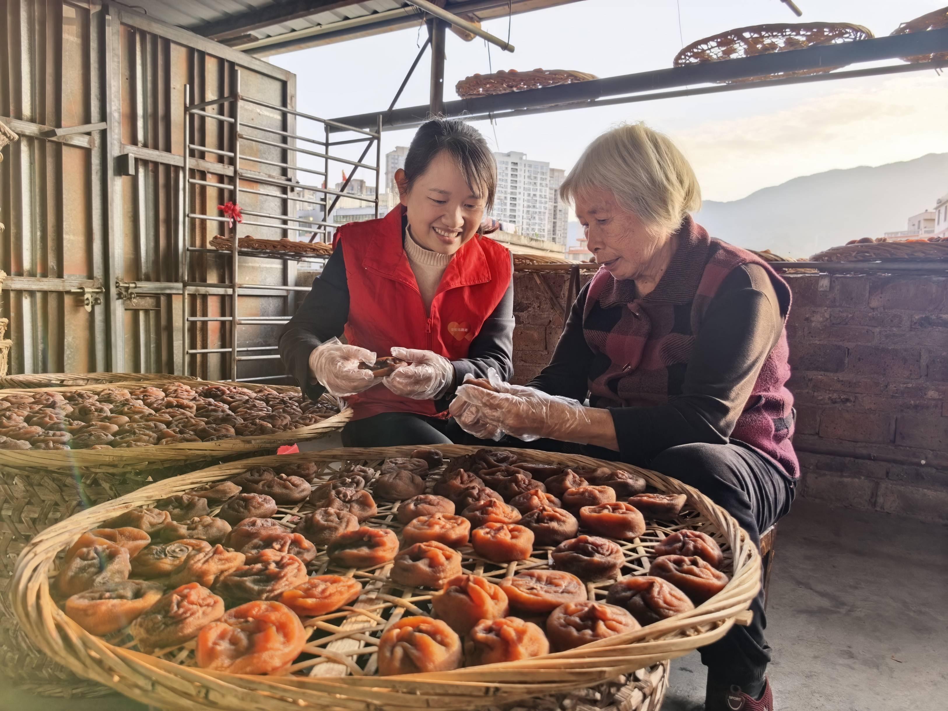 针对企业核心加工环节的用工需求,志愿者们分工明确、靶向发力,全程扎根生产一线提供精准帮扶。在晾晒区,面对 “日照、间距、翻晒” 三大关键要求,志愿者们在有着数十年加工经验的殷阿婆指导下,逐排梳理晾晒架,将新鲜柿果均匀摆放,确保每颗柿果日照充足、通风良好。“柿饼要好吃,一定要花时间,一点都不能偷懒。” 志愿者们循着殷阿婆的叮嘱,用心把控晾晒细节。
