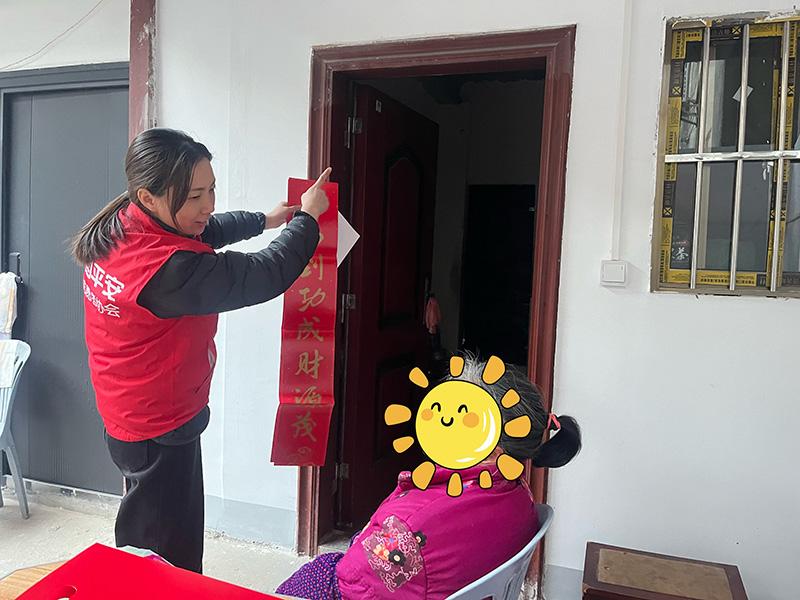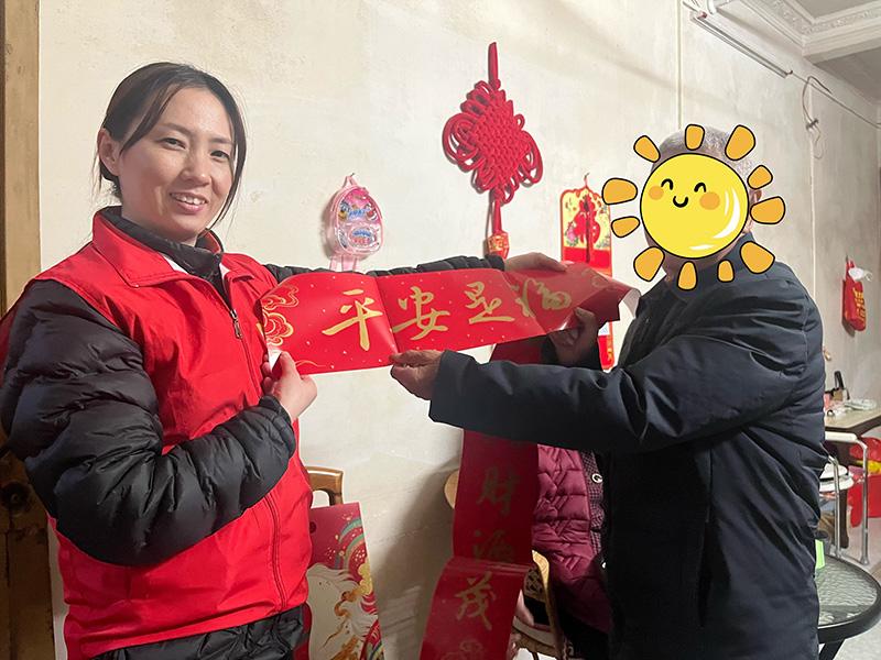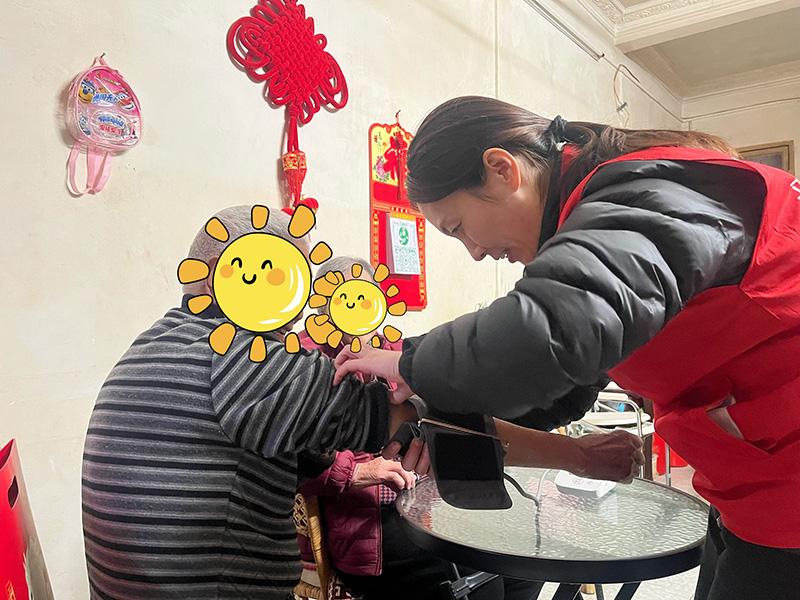 不只是餐食,更有心意。每个新春礼包都精心准备——精美春联、喜庆窗花,红纸黑字,贴的是年味,暖的是人心。平安志愿者还携带便携式血压仪,为每位老人现场测量,叮嘱用药与保暖事项,把健康管理送到家。