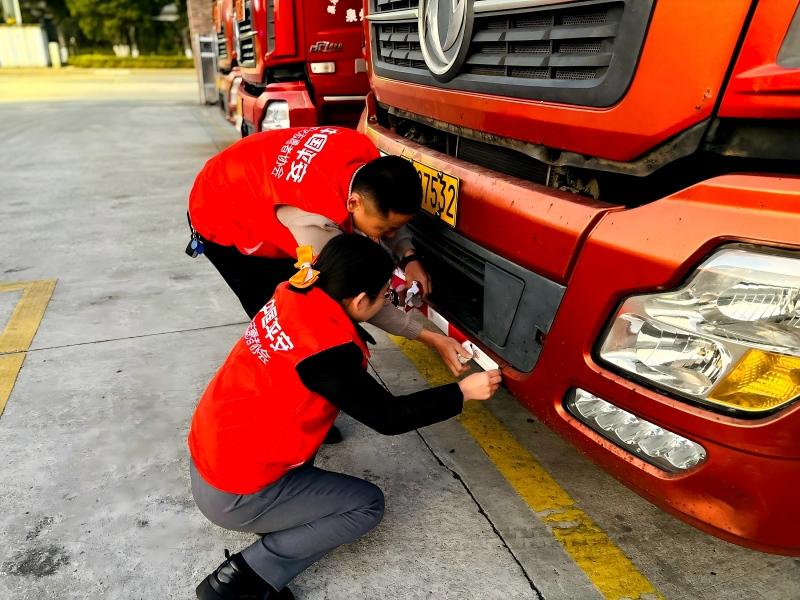活动现场,志愿者们分工协作,仔细为油罐车的车身框架、三轮车的车厢边缘等关键位置粘贴反光贴,确保车辆在低光环境下的可视性大幅提升,从细节处降低运输途中的安全风险,同时细致检查车辆刹车、灯光、轮胎等关键部件,针对老化、磨损等问题给出即时维修和日常养护的预防建议。张贴间隙,志愿者还向企业负责人及驾驶员普及冬季行车安全知识、保险理赔注意事项,同步对接后续雇主责任险投保需求,细致解答保障范围、理赔流程等疑问,一站式解决客户疑问,让企业省心又安心。“贴上反光贴,车子跑夜路更安全,平安这波‘福礼’太实在了!”企业车队负责人感慨道。