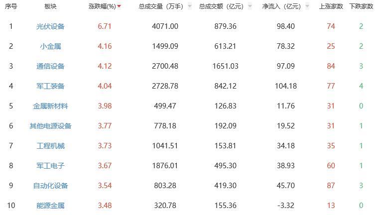 板块方面,光伏设备、小金属、通信设备等涨幅居前,银行、保险下跌。