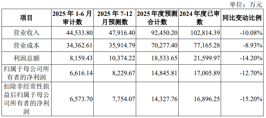 世盟股份2025年度预计实现营业收入92,450.20万元,较2024年下降10.08%;预计实现归属于母公司所有者的净利润为14,845.81万元,较2024年下降12.70%;预计扣除非经常性损益后归属于母公司所有者的净利润为14,327.76万元,较2024年下降15.20%。
