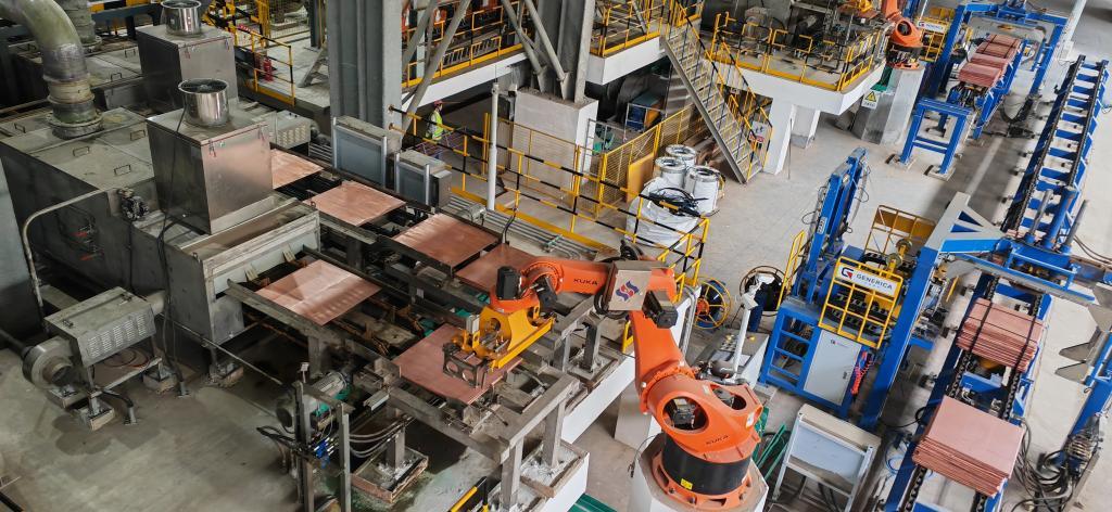 图为云南铜业股份有限公司西南铜业分公司生产车间。新华社记者浦超 摄 楚雄市城郊的楚雄滇中有色金属有限责任公司,新升级的电解作业区全面投入生产。该公司主要产品为阴极铜和硫酸,为延伸产业链,公司对现有生产工艺进行了升级改造,阴极铜年产能增加到20万吨,目前处于满负荷生产状态。