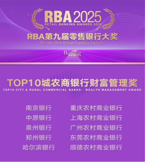 近日,在2025“RBA第九届零售银行大奖”评选中,泉州银行荣获“TOP10城农商银行财富管理奖”。