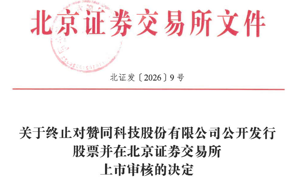 中国经济网北京2月27日讯 北交所网站今日公布关于终止对赞同科技股份有限公司(以下简称“赞同科技”)公开发行股票并在北京证券交易所上市审核的决定。