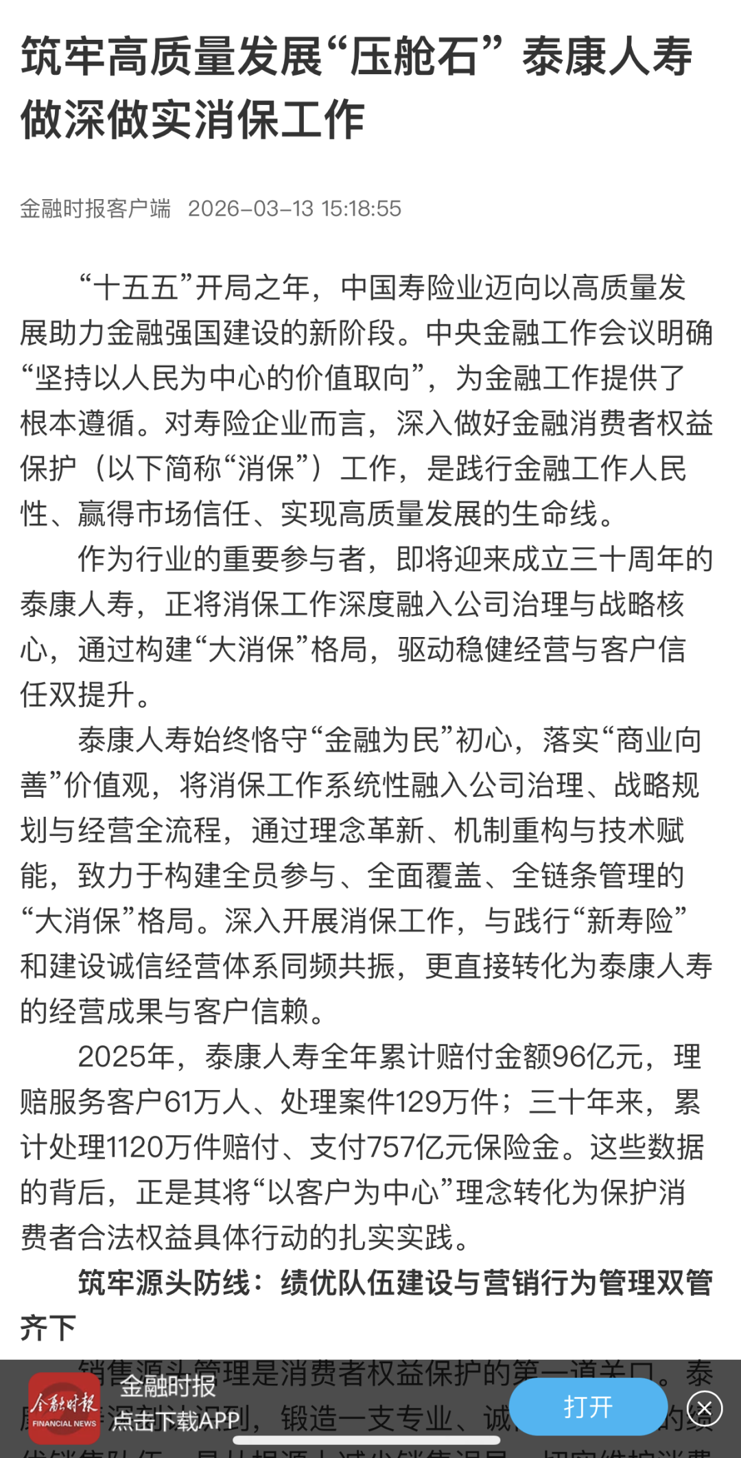 “十五五”开局之年,中国寿险业迈向以高质量发展助力金融强国建设的新阶段。中央金融工作会议明确“坚持以人民为中心的价值取向”,为金融工作提供了根本遵循。对寿险企业而言,深入做好金融消费者权益保护(以下简称“消保”)工作,是践行金融工作人民性、赢得市场信任、实现高质量发展的生命线。作为行业的重要参与者,即将迎来成立三十周年的泰康人寿,正将消保工作深度融入公司治理与战略核心,通过构建“大消保”格局,驱动稳健经营与客户信任双提升。 泰康人寿始终恪守“金融为民”初心,落实“商业向善”价值观,将消保工作系统性融入公司治理、战略规划与经营全流程,通过理念革新、机制重构与技术赋能,致力于构建全员参与、全面覆盖、全链条管理的“大消保”格局。深入开展消保工作,与践行“新寿险”和建设诚信经营体系同频共振,更直接转化为泰康人寿的经营成果与客户信赖。2025年,泰康人寿全年累计赔付金额96亿元,理赔服务客户61万人、处理案件129万件;三十年来累计处理1120万件赔付、支付757亿元保险金。这些数据的背后,正是其将“以客户为中心”理念转化为保护消费者合法权益具体行动的扎实实践。 筑牢源头防线: 绩优队伍建设与营销行为管理 双管齐下 销售源头管理是消费者权益保护的第一道关口。泰康人寿深刻认识到,锻造一支专业、诚信、高素质的绩优销售队伍,是从根源上减少销售误导、切实维护消费者合法权益的基石。泰康人寿将队伍建设提升至战略高度,通过“优增优育”的系统性工程,将消保要求深度融入人才“选、用、育、留”全流程。 严把“招募关”,以高标准实现源头筛选。泰康人寿确立“优增”导向,聚焦契合现代保险服务的“四化”(职业化、专业化、绩优化、年轻化)人才,从起点提升队伍基本面;通过价值观、事业心等多维度评估及明确的合规标准,严控准入质量。以泰康医养生态与保险事业平台赋能,增强职业吸引力。集泰康集团之力打造HWP(健康财富规划师)品牌,吸引“四化”人才加盟,从“入口”保障营销队伍基盘优质、理念同频。 夯实“培训关”,以专业化锻造服务能力。围绕HWP“保险顾问、医养顾问、理财顾问”的职责定位,泰康人寿构建了系统化、多层次的培训体系。创新培训模式,将实体医养生态体验与专业销售训练深度融合,整合武汉大学医学部及泰康五大医学中心等资源,强化健康服务场景实践;联动内外部财富管理平台,深化对全财富周期解决方案的理解。完备的培训体系,旨在将销售人员培育成能为客户提供全生命周期综合解决方案的专业伙伴,从根本上提升服务适配性。 强化“管理关”,以全流程管控规范销售行为。泰康人寿将“诚信合规”作为队伍管理的生命线。面向基层,对销售人员开展适当性管理等消费者权益保护专项培训,并测试以提升培训效果。建立销售行为可回溯、代理人“诚信档案”等全过程可追溯管理机制。通过激励体系引导长期服务,明确“销售误导零容忍”原则,推动队伍专业能力提升,将合规要求内化为队伍的行为自觉。 通过招募、培训、管理三个层面的闭环建设,泰康人寿持续推进销售队伍绩优转型,不仅为业务高质量发展注入持久动能,更从销售源头筑牢了消保的坚固堤坝,让“金融为民”的初心落在实处。 强化刚性约束: “三适当”原则 贯穿金融保险服务全流程 “将适当的产品通过适当的销售渠道销售给适当的客户”是监管的核心要求,也是泰康人寿消保工作的关键着力点。2025年,在监管理念的指导下,泰康人寿系统性构建并全面落实了适当性管理体系。 建立健全制度与分类标准。在产品端,修订《人身保险产品分类分级管理制度》,综合考虑产品类型、保障责任、利益确定性等因素,将人身险产品科学划分为P1至P5五个复杂度等级,并对投连险等产品进行R1至R5五级风险评级,为精准匹配奠定基础。实施严谨的客户评估与匹配校验,设计了包含保险保障需求、财务支付水平及风险承受能力评估的客户适当性问卷,投保中系统自动校验客户评估结果与所投产品风险等级匹配性,进行相应处置和建议。 着力加强源头风险拦截。在承保环节,对疑似高风险行为系统化严控风险。进行风险前置管理,对投诉进行回溯分析,主动识别高风险客户,提前干预化解,将纠纷化解在萌芽状态。 通过系统建设实现制度管控闭环。泰康人寿已建立刚性约束机制,客户适当性评估成为投保流程中的必经前置环节,系统还对客户评估频次合理限制,避免频繁评估影响结果客观性。 优化服务体验: 以有温度的金融守护 提升消费者获得感 金融消保的最终落脚点是提升消费者的获得感、幸福感、安全感。泰康人寿超越传统保单服务范畴,在金融教育、普惠服务与纠纷化解等多维度优化消费者体验,构筑了一张有温度的全生命周期权益保护网。 消费者服务聚焦特殊群体,彰显人文关怀。泰康人寿持续优化适老化服务,95522热线开通“老年人一键通”,柜面设置爱心、耐心、安心“三心”服务标准;为残障人士、军人、外籍人士等群体提供更加细致和人性化的服务;持续优化“健保通”直付理赔、“泰康绿通”就医服务等特色便民举措,将“以人民为中心”的发展思想转化为为民办实事、守护客户美好生活的具体行动。 推动金融教育宣传常态化、实效化。泰