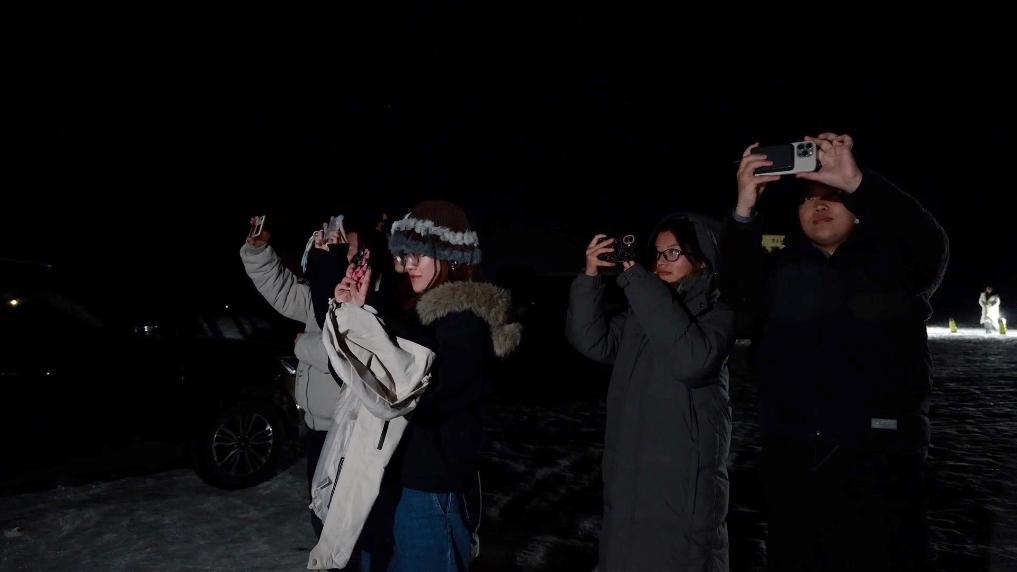 在漠河市北极镇北极村,虽然夜间室外温度非常低,却丝毫没有阻挡大批游客追光的热情。