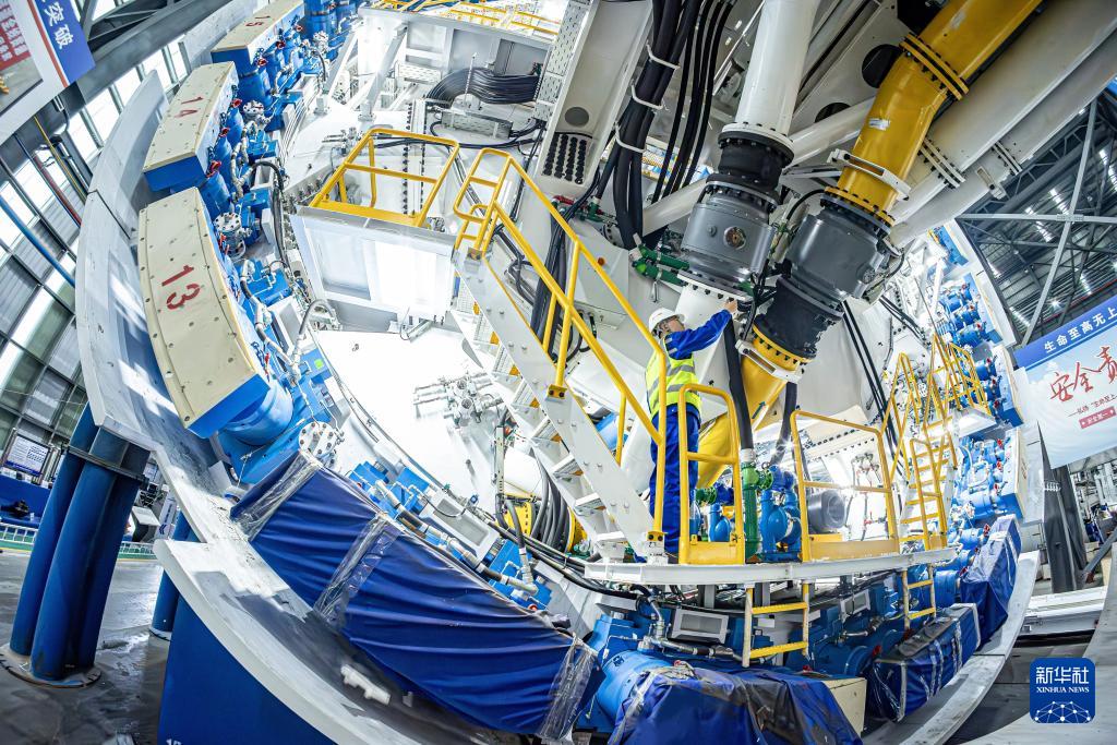 3月31日,中铁十四局监造人员验收盾构机泥浆环流系统。新华社发(刘甲摄) 盐宜高铁长江隧道是全线控制性工程,北连靖江市,南接江阴市,全长8130米。隧道以盾构法穿越长江,需独头掘进6710米,长距离穿越软土、高水压地层等复杂地质带。针对长江隧道盾构掘进特点,中国铁建研制团队量身打造“奋楫号”盾构机。“奋楫号”整机全长145米,总重约3800吨,刀盘开挖直径达14.33米,集成了远程掘进驾驶、关键部件实时监测、管片箱涵智能拼装的整体性功能,将推动实现“智能掘进、智能拼装、高效成型”的一体化、全智能建造新模式。