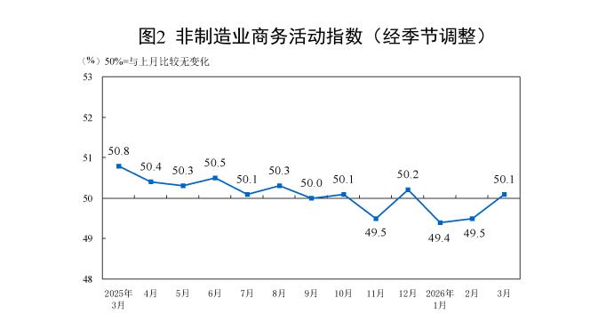 二、中国非制造业采购经理指数运行情况 3月份,非制造业商务活动指数为50.1%,比上月上升0.6个百分点,高于临界点,非制造业景气水平有所改善。