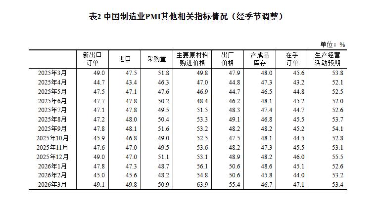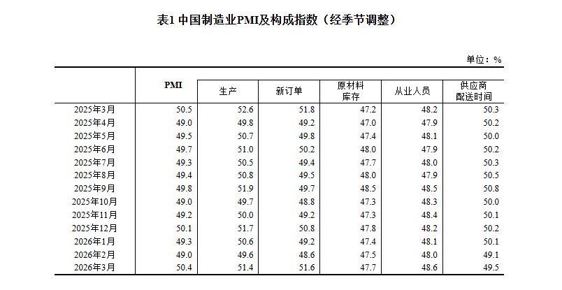 从企业规模看,大型企业PMI为51.6%,比上月上升0.1个百分点,高于临界点;中、小型企业PMI分别为49.0%和49.3%,比上月上升1.5个和4.5个百分点,低于临界点。 从分类指数看,构成制造业PMI的5个分类指数中,生产指数和新订单指数均高于临界点,原材料库存指数、从业人员指数和供应商配送时间指数均低于临界点。 生产指数为51.4%,比上月上升1.8个百分点,表明制造业生产活动加快。 新订单指数为51.6%,比上月上升3.0个百分点,表明制造业市场需求景气水平明显改善。 原材料库存指数为47.7%,比上月上升0.2个百分点,表明制造业主要原材料库存量降幅有所收窄。 从业人员指数为48.6%,比上月上升0.6个百分点,表明制造业企业用工景气度回升。 供应商配送时间指数为49.5%,比上月上升0.4个百分点,低于临界点,表明制造业原材料供应商交货时间较上月延长。