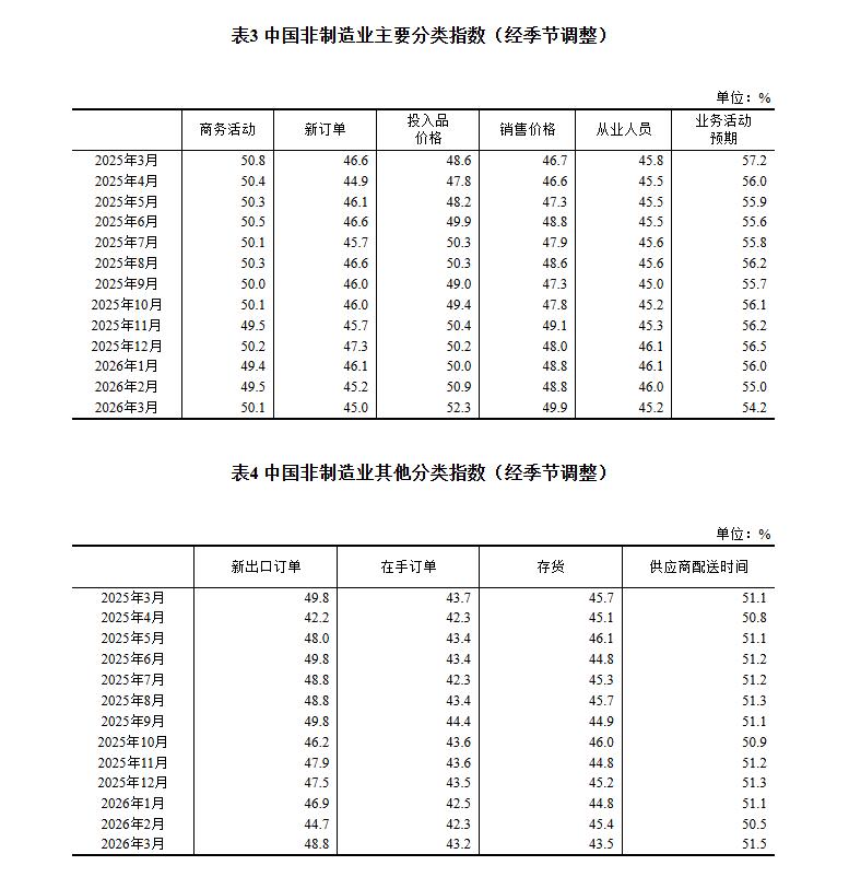 新订单指数为45.0%,比上月下降0.2个百分点,表明非制造业市场需求有所回落。分行业看,建筑业新订单指数为43.5%,比上月上升1.3个百分点;服务业新订单指数为45.3%,比上月下降0.4个百分点。 投入品价格指数为52.3%,比上月上升1.4个百分点,表明非制造业企业用于经营活动的投入品价格总体水平继续上涨。分行业看,建筑业投入品价格指数为52.7%,比上月上升3.6个百分点;服务业投入品价格指数为52.2%,比上月上升1.0个百分点。 销售价格指数为49.9%,比上月上升1.1个百分点,仍低于临界点,表明非制造业销售价格总体水平降幅收窄。分行业看,建筑业销售价格指数为49.3%,比上月上升1.7个百分点;服务业销售价格指数为50.0%,比上月上升1.0个百分点。 从业人员指数为45.2%,比上月下降0.8个百分点,表明非制造业企业用工景气度回落。分行业看,建筑业从业人员指数为39.1%,比上月下降3.4个百分点;服务业从业人员指数为46.2%,比上月下降0.4个百分点。 业务活动预期指数为54.2%,比上月下降0.8个百分点,仍位于临界点以上,表明非制造业企业对市场发展保持乐观。分行业看,建筑业业务活动预期指数为50.5%,比上月下降0.4个百分点;服务业业务活动预期指数为54.8%,比上月下降1.0个百分点。