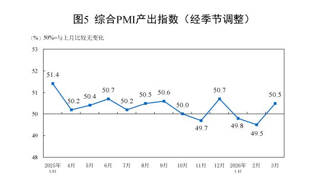 三、中国综合PMI产出指数运行情况 3月份,综合PMI产出指数为50.5%,比上月上升1.0个百分点,高于临界点,表明我国企业生产经营景气水平总体向好。