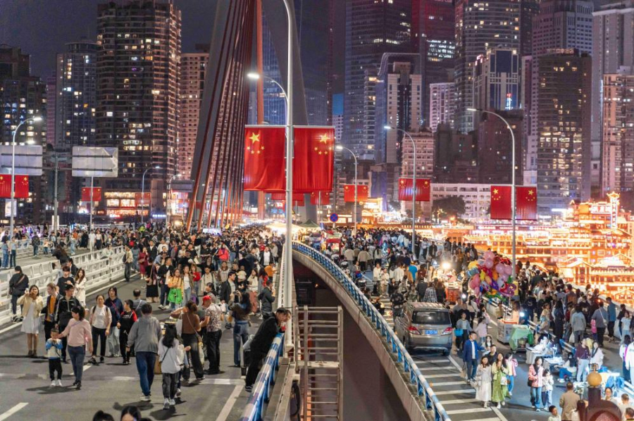 重庆千厮门大桥成为游客的“观景平台”。新华网发(罗云希 摄) “最宠游客的城市”是网友给重庆贴上的另一标签。紧邻洪崖洞的千厮门大桥,每到节假日便会“封桥让路”变为人行天桥,这一做法已持续多年。 为提升游客打卡体验,重庆专门对“我在重庆”人行天桥进行改造,拓宽观景平台、优化拍摄视角。“以前游客在马路边拍照,人车混流,很危险,现在不少游客反馈视野更开阔、打卡更从容。”重庆市两江新区观音桥国际消费集聚区管理局党政办公室主任耿建峰说。 多位游客反馈,相比几年前,热门景区的排队秩序、指引标识、便民设施都有改善。“虽然人越来越多,但能感觉到城市在用心接待。” 特色资源激活县域旅游 打破“主城独大”的格局,立足各区县资源禀赋走差异化发展之路,是重庆文旅转型的重要方向。 重庆市文旅委规划发展处负责人介绍,近年来,重庆以“一县一特色”为思路,推动多个区县挖掘自身特色,县域文旅资源逐步被激活。 去年,“甲亢哥”直播中被投喂的荣昌卤鹅意外走红。荣昌区文化旅游委副主任张志秀回忆:“那波流量来得很快,我们立刻抓住机会,深挖卤鹅历史,将其与荣昌夏布、荣昌陶器等非遗元素融合,打造‘千年荣昌’品牌。”2025年,荣昌接待游客约2800万人次,同比增长近50%,安陶小镇、夏布小镇等重点景区接待量同比增长最高达743%。